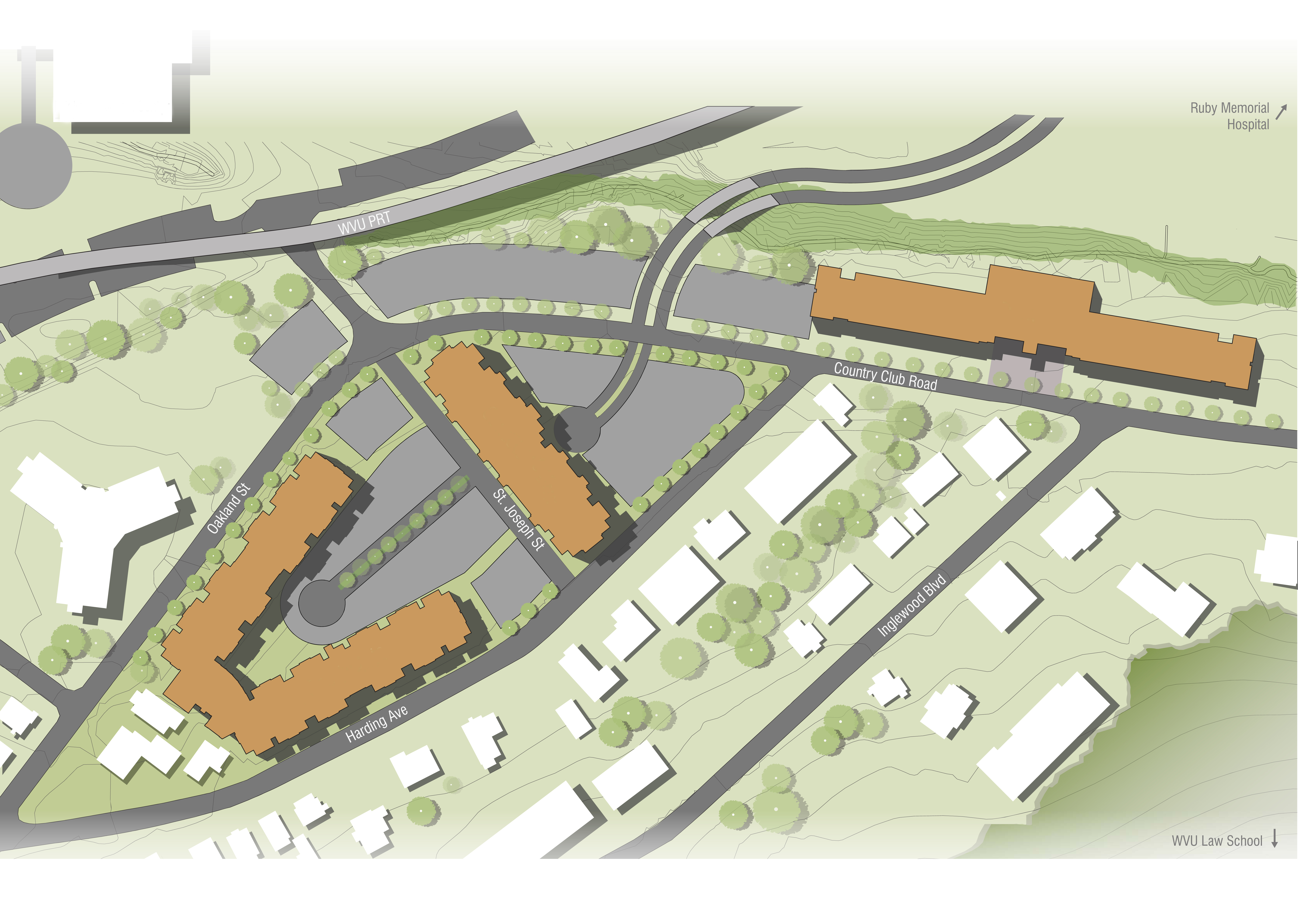 The site is centrally located between the University’s Evansdale and Health Sciences campuses, as well as near the College of Law, two PRT stations, the Student Recreation Center, sports recreation fields and Milan Puskar Stadium. With its proximity to existing WVU facilities, this location will facilitate pedestrian traffic and reduce vehicular traffic.